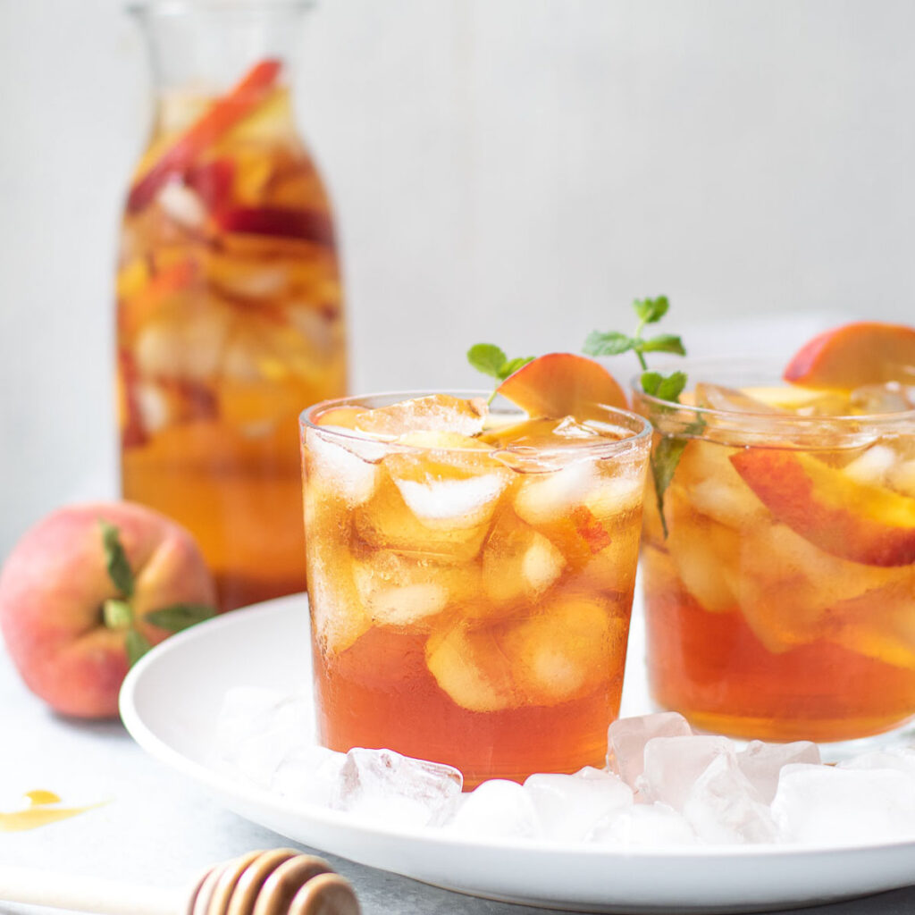 6. Soğuk çayı buzdolabında en az 1-2 saat dinlendirin, böylece şeftalinin ve diğer aromaların çaya geçmesini sağlayın.
