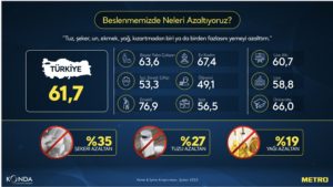 Tüketicilerin yarısından fazlası, ne yiyeceklerine karar verirken sağlıklı beslenme tercihi olduğunu belirtiyor. Araştırmaya göre beslenmelerinde şekeri azaltanların oranı %35, tuzu azaltanların oranı %27 ve yağı azaltanların oranı ise %19. Fakat toplumun yarısı bağışıklık sistemini güçlendirmek için özel bir şey tüketmiyor. Kalan yarısı ise sırasıyla et, kemik, ilik ve tavuk suyu gibi ürünler, organik doğal besinler, kefir ve ev yoğurdu, doğal bitki çayları ile vitamin ve kolajen tüketiyor.