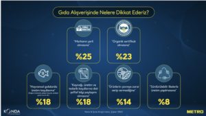 Araştırmaya göre, tüketicilerin yerel ve yöresel ürünlere gösterdiği talep giderek artarken, market markalı ürünlere de talep oldukça yüksek. Gıda alışverişinde ürünlerin uygun fiyatlı olmasına dikkat edilme oranı %86 ile ilk sırada gelirken; yöresel ürün almaya gayret edenlerin oranı %51, market markalı ürün alanların oranı ise %42 şeklinde. Her 4 kişiden 1’i ise alışveriş yaparken ürünün yerli olmasına dikkat ediyor. Organik sertifikalı olmasına dikkat edenlerin oranı %23 iken; hayvansal gıdalarla üretim koşullarına dikkat edenlerin oranı %18, ürünün çevreye zarar verip vermediğine dikkat edenlerin oranı ise %14.