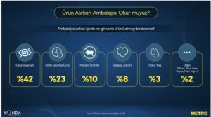 Genel anlamda kentleşme ve modernleşme eğilimine tezat bir şekilde ambalaj okuma eğiliminde azalma var. Toplumun %42’lik kısmı ambalaj okumuyor, okuyanlar ise büyük oranla sadece son kullanma tarihine bakıyor. İkinci sırada içeriğinde haram ürün olup olmamasının kontrolü ve üçüncü sırada ise sağlığa zararlı olabilecek ürünlerin kontrolü geliyor. Ambalaj okuyanlardan %23’ü tarihi geçmiş ürün almayacağını söylüyor.