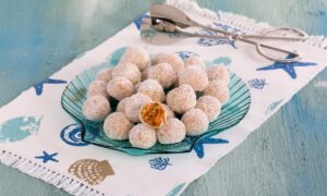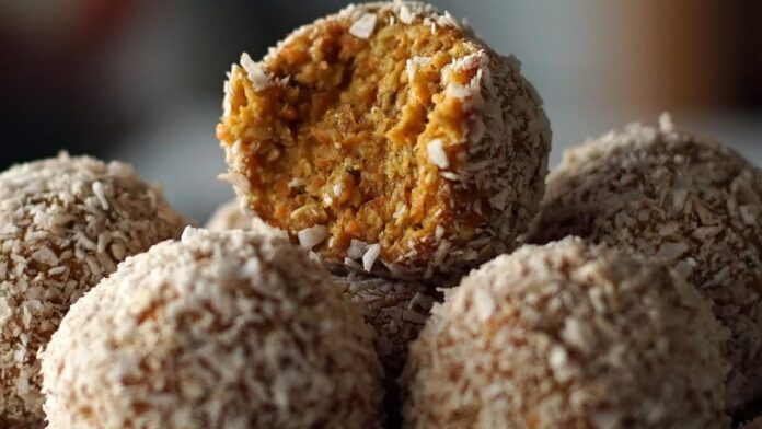 Kurutulmuş yaban mersini hariç bütün malzemeleri bir mutfak robotuna koyun, iyice karışana ve kurabiye hamuru gibi bir kıvam elde edilene kadar karıştırın. Elde ettiğiniz karışımı bir kaba boşaltın ve 1/4 bardak kurutulmuş yaban mersinini bütün karışıma yayılana dek ellerinizle karıştırın. Elde ettiğiniz “hamur”u istediğiniz gibi şekillendirin; ister küçük toplar yapın ya da hamuru biraz açarak içinden kurabiye kalıbıyla kareler çıkartın. Daha sonra da üzerine fazladan ayırdığınız hindistan cevizinden serpin.