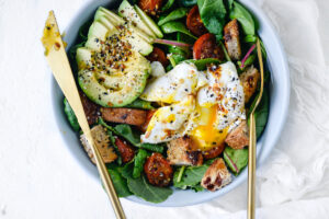 Kahvaltı salatanıza bir protein kaynağı eklemek, açlığı azaltmanın ve tokluğu korumanın yanı sıra sağlıklı kemikleri desteklemede ve kas kütlenizi korumada etkilidir. Hayvansal protein kaynakları arasında deniz ürünleri, yumurta, et ve peynir gibi süt ürünleri bulunur. Bitki kaynakları arasında tofu, tempeh, fasulye, bezelye, fındık, tohumlar ve kinoa gibi belirli tam tahıllar bulunur.