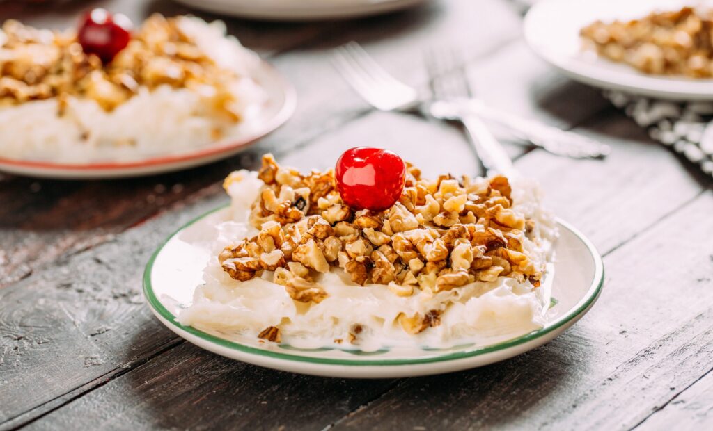 2. Muhallebili Güllaç: Güllaç yaprakları, süt ile ıslatılıp bir tepsiye dizilir. Üzerine muhallebi veya vanilyalı puding sürülür. Bu işlem, güllaç yaprakları ve muhallebi/puding bitene kadar tekrarlanır. Son katın üzerine ceviz, fındık veya badem serpiştirilerek servis edilir.